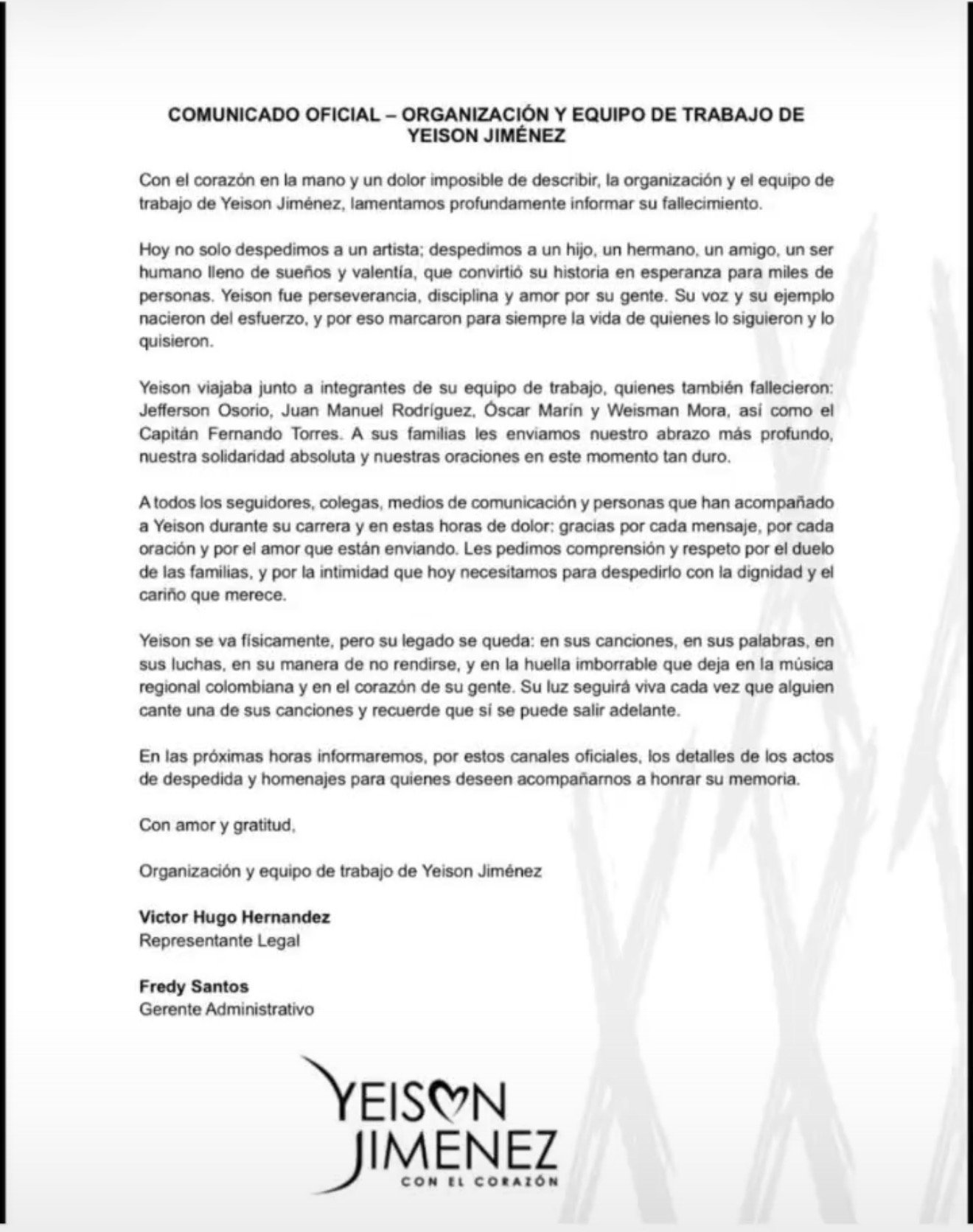 Las autoridades aeronáuticas y los equipos de emergencia llegaron al lugar del siniestro y confirmaron que ninguno de los seis ocupantes sobrevivió al choque. Además de Yeison Jiménez, quienes fallecieron incluyen al piloto, al copiloto y a varios miembros del equipo de trabajo del artista.